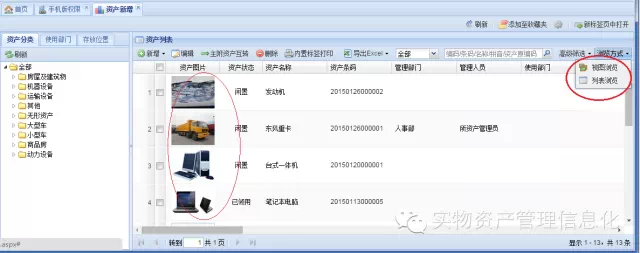 每个资产管理员管理的资产很多,在浏览时,只有文字列表会很枯燥,眼睛也容易疲劳看花,切换为图形浏览模式,即直接在浏览列表查看到资产照片的缩略图,点击还可查看此资产的所有照片。